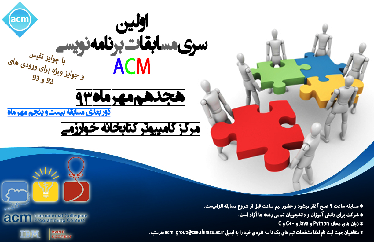 انجمن برنامه نویسی ACM دانشگاه شیراز در ادامه فعالیت های سال ۱۳۹۴ خود، اولین مسابقه اینترنتی خود را در تاریخ 21 آبان ساعت 14 تا 19 در سایت sharecode برگزار می کند. جهت یکپارچه سازی این مجموعه از مسابقات اینترنتی، علاقه مندان باید از طریق آدرس