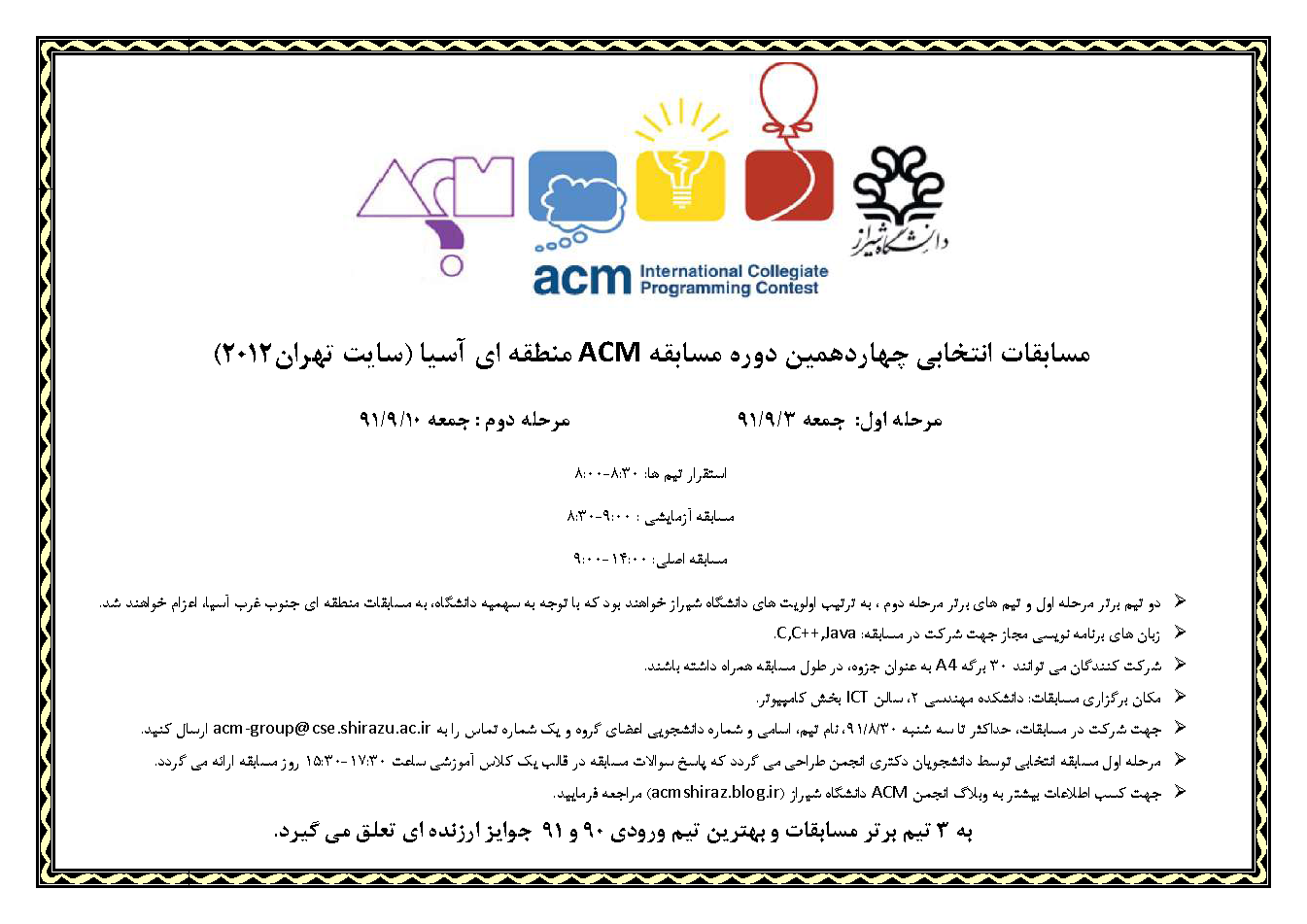 به اطلاع می رساند کارسوق آموزشی ACM جهت افزایش آمادگی نمایندگان دانشگاه شیراز در مسابقات منطقه ای غرب آسیا(سایت تهران) 2012 با تدریس آقای پویا ظفر اسدالله پور(عضو تیم PMP، قهرمان مسابقات منطقه ای ACM سال های 2011 و 2010) در تاریخ 10/9/91 از ساعت 8:30 تا 17برگزار می گردد.