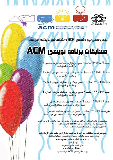 در مراسم معارفه نوشکفتههای بخش مهندسی و علوم کامپیوتر و فنآوری اطّلاعات دانشگاه شیراز ، سوالات اولین مسابقهی حل مسألهی نوشکفتهها در اختیار نوشکفتهها قرار گرفت که جهت حل آن تا پنجشنبه 4 آبانماه 91 فرصت دارید. در روز جمعه در حاشیهی مسابقهی ACM ضمن معرفی برگزیدگان، حل سوالات نیز ارائه خواهد شد.